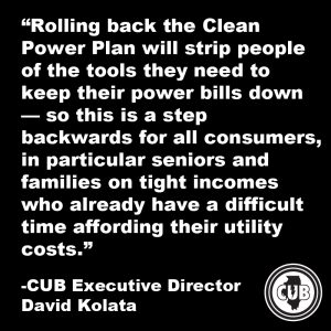 “Any attempt by the Administration to weaken or repeal the Clean Power Plan is bad news for consumers. The Clean Power Plan would have led to increased investment in energy efficiency that reduces our electric bills and helps to create a more reliable power grid. It also would have sparked energy innovation, advancing new money-saving technologies in key areas such as efficiency and storage. Rolling back the Clean Power Plan will strip people of the tools they need to keep their power bills down—so this is a step backwards for all consumers, in particular seniors and families on tight incomes who already have a difficult time affording their utility costs. Today’s development reinforces the importance of Illinois passing the Future Energy Jobs Act last year to set the state on a course to a more reliable and affordable energy future. Regardless of developments in Washington, CUB will continue to work with legislators, regulators and consumer advocates to help improve the lives of electric customers across the state of Illinois.”