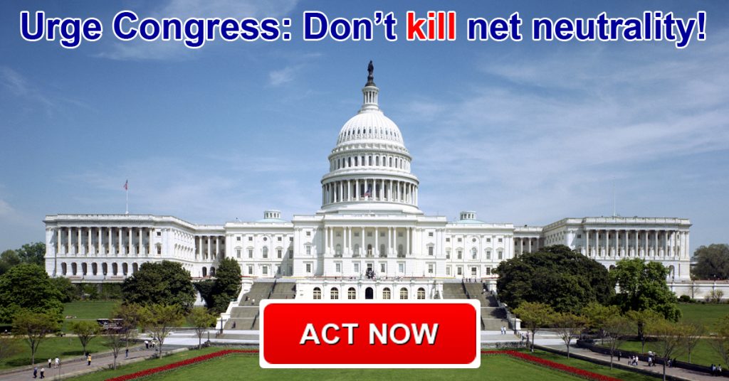 Please, let your representative in Congress know loud and clear that you oppose any effort on Capitol Hill to weaken or crush the current net neutrality consumer protections.