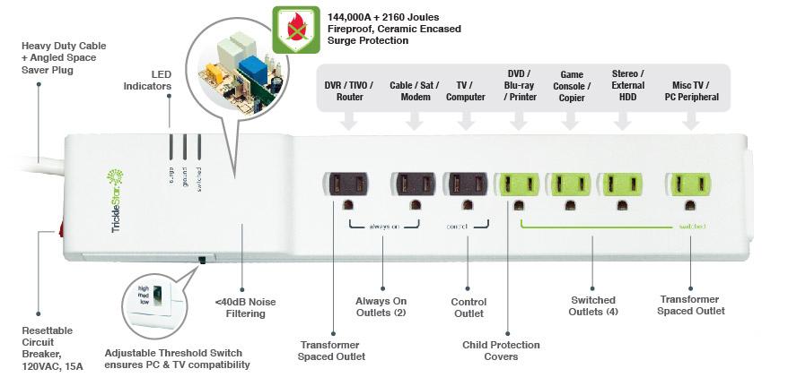 - Power strips. The convenient on/off switch on a standard power strip allows you to “unplug” many devices that are connected to it. But smart power strips are even better. They’re equipped with special outlets that automatically shut off certain devices when not in use. Other devices that you may not want to shut off, like a cable box, can be plugged into special “always on” outlets.