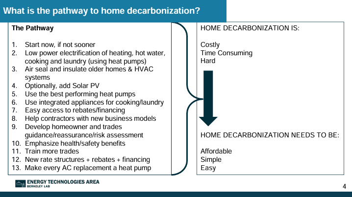 The remainder of the workshop focused on electrification as a decarbonization pathway. Iain Walker, from Lawrence Berkeley National Laboratory, spoke about residential electrification and Nik Sawe, from Energy Innovation, covered industrial electrification. Both presentations were thorough, and I would encourage people to watch them. The Lawrence Berkeley slides covered concerns that CUB often hears from homeowners.