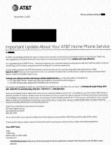 - One letter, to current customers of AT&T’s traditional landline phone service, informs them that their service will be discontinued “on or after March 15, 2027.”