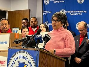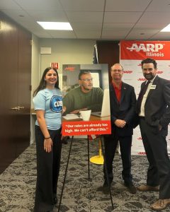 Zoe from CUB joined AARP Illinois and Illinois PIRG representatives at a news conference against Nicor’s rate hike. The advocates announced that they had gathered more than 35,000 petition signatures against the Nicor increase.