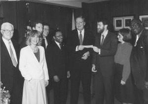 In 1984, State Comptroller Roland Burris (left) and Gov. James Thompson (center) presented CUB with a $100,000 state start-up loan. CUB Board President Howard Learner and Executive Director Susan Stewart accepted the check. We paid the loan back, with interest.