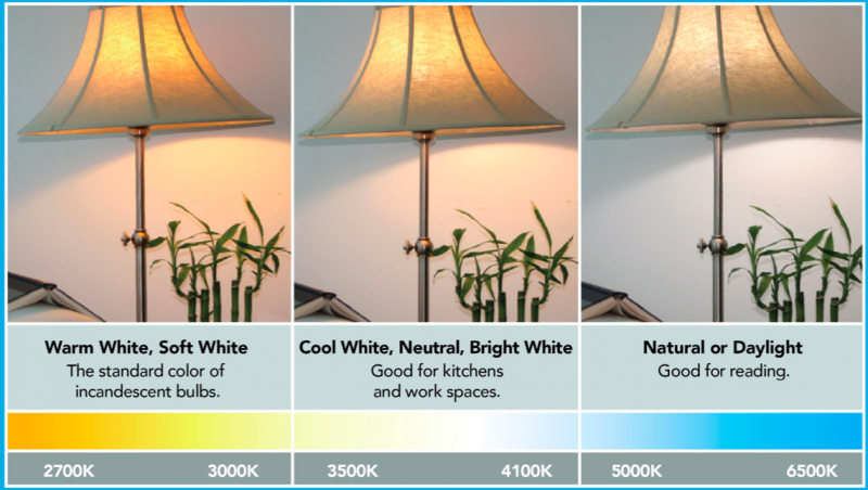 LEDs come in different light temperatures, measured by the Kelvin scale, from a warm, yellowish appearance to a cooler, almost blue light (the graphic below gives you a general idea of the colors). Warm or soft white bulbs (yellowish appearance, about 2,500-3,000 K) can be used for most indoor applications. A neutral or cool white is good for the kitchen and workspaces, and daylight bulbs (with a brightness described by Energy Star as “blue sky at noon,” roughly 6,000 K and up) are recommended for reading.