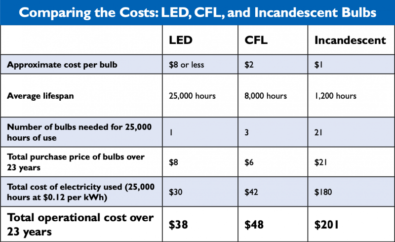 To compare the longterm costs of CFLs, LEDs and incandescent bulbs, consult the chart below.
